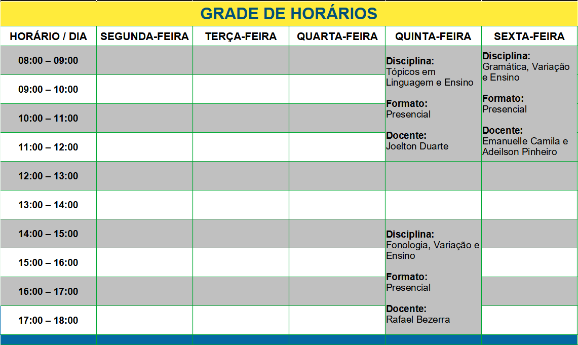 Início do semestre: 21 de agosto (considerando o calendário da PRPPGI- UFAPE). Término: 19 de dezembro.